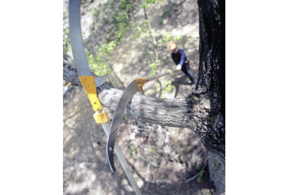 The blades have a lower sickle for undercutting bark and removing epicormics with a clean cut to avoid damaging the tree and an upper sickle for cutting vines – these sickles also help prevent the blade slipping off the branch. The lower sickle can be removed if necessary. The Hayate Pole Saw comes equipped with a rigid-plastic blade guard with a built-in carrying handle. In addition, the base pole includes a pole end shock absorber to help protect the pole when resting on the ground.